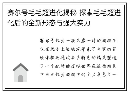 赛尔号毛毛超进化揭秘 探索毛毛超进化后的全新形态与强大实力